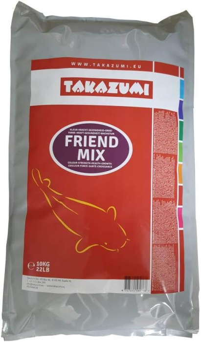 Takazumi Friend Mix este o hrană completă ieftină, care susține dezvoltarea culorii, sănătatea și creșterea koi-urilor tale. Friend Mix este conceput pentru a satisface nevoia unei hrane de calitate, la un preț accesibil. Peletele plutitoare de 6 mm nu sunt doar bune pentru koi-urile tale, ci nu poluează apa iazului și nu suprasolicită filtrul biologic.