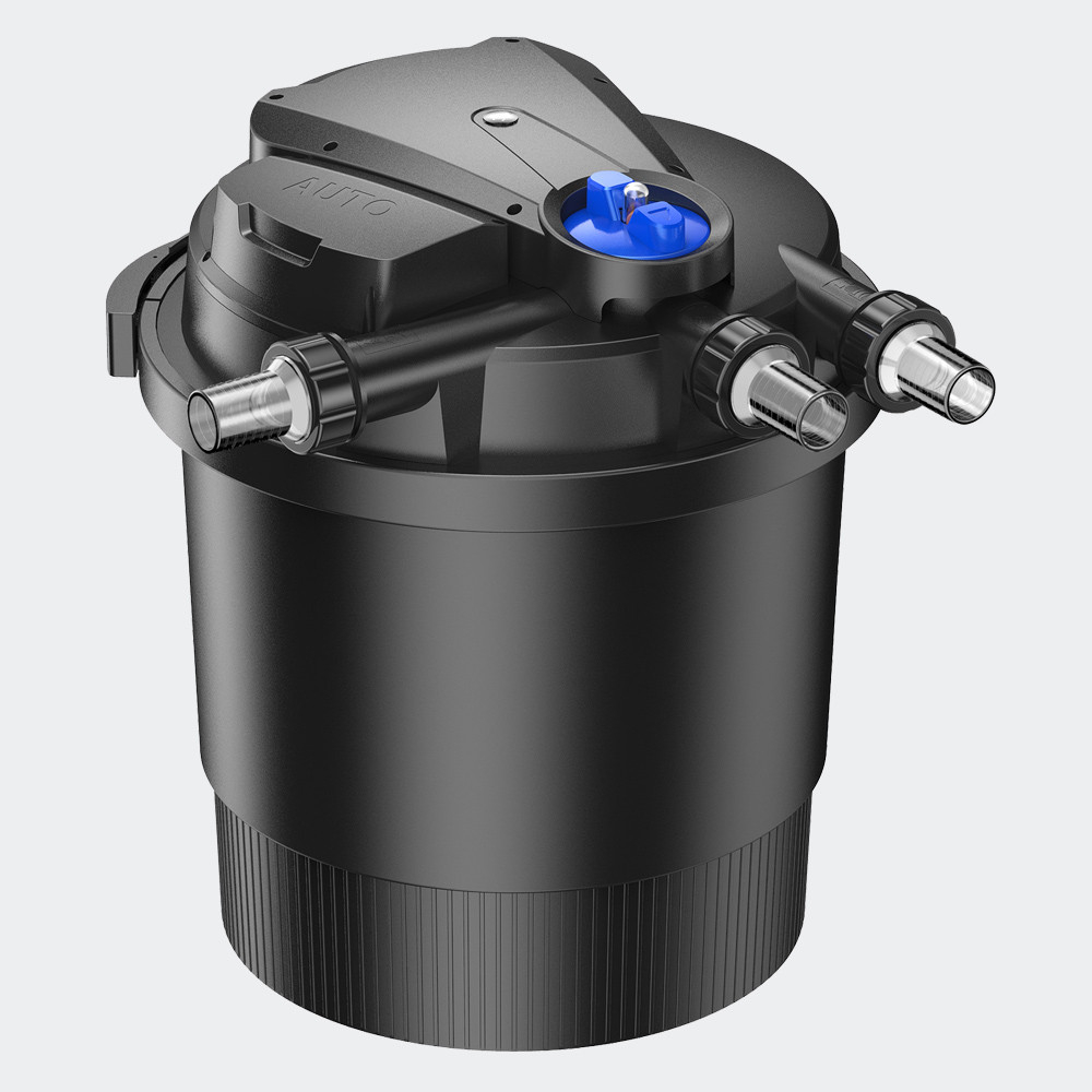 • Noua generatie de filtru de iaz: filtru de iaz de presiune bio CPA-20000 • indicator de poluare • debit mare • dezvoltarea optimă a filtrului biologic de iaz • sistem de filtrare pentru iaz cu bio-presiune ușor și necomplicat • acest sistem oferă apă limpede rapidă și fiabilă • spalare usoara in contra-spalare (prin apasarea unui comutator) • diferite materiale filtrante (spume speciale de filtrare) Avantaje: Filtru de presiune mecanic și biologic cu clarificator UVC integrat. Toate conexiunile și tehnologia sunt în capac/capac, filtrul poate fi îngropat de capac pentru ascunderea fără dificultate. Funcție de spălare cu indicator de întreținere. Curatenie si mentenanta: Apa poate fi pompată într-o cascadă mai înaltă și apoi dusă înapoi în iaz. Întreținerea anuală se limitează la verificarea mediilor filtrante și a lămpii UV. Filtrul are o funcție modernă de spălare care poate fi reglată prin intermediul unui comutator cu patru funcții. Cu comutatorul aveți următoarele posibilități de setare: Funcția de spălare EasyClean: • Comutați poziția „Filtru” Funcționare normală - apa trece prin filtrul iazului sub presiune cu ajutorul unei pompe de iaz și se întoarce curat în iaz. • Poziția comutatorului „Clean” Mod de curățare - Prin rotirea comutatorului motorul care este integrat în partea superioară a filtrului este pornit și face ca bureții de filtrare să se rotească în interiorul filtrului de iaz și îi curăță de murdăria grosieră fără a deschide filtrul de iaz. In timpul operatiei de curatare apa murdara este evacuata printr-un racord suplimentar si poate fi folosita de exemplu pentru irigarea gradinii.